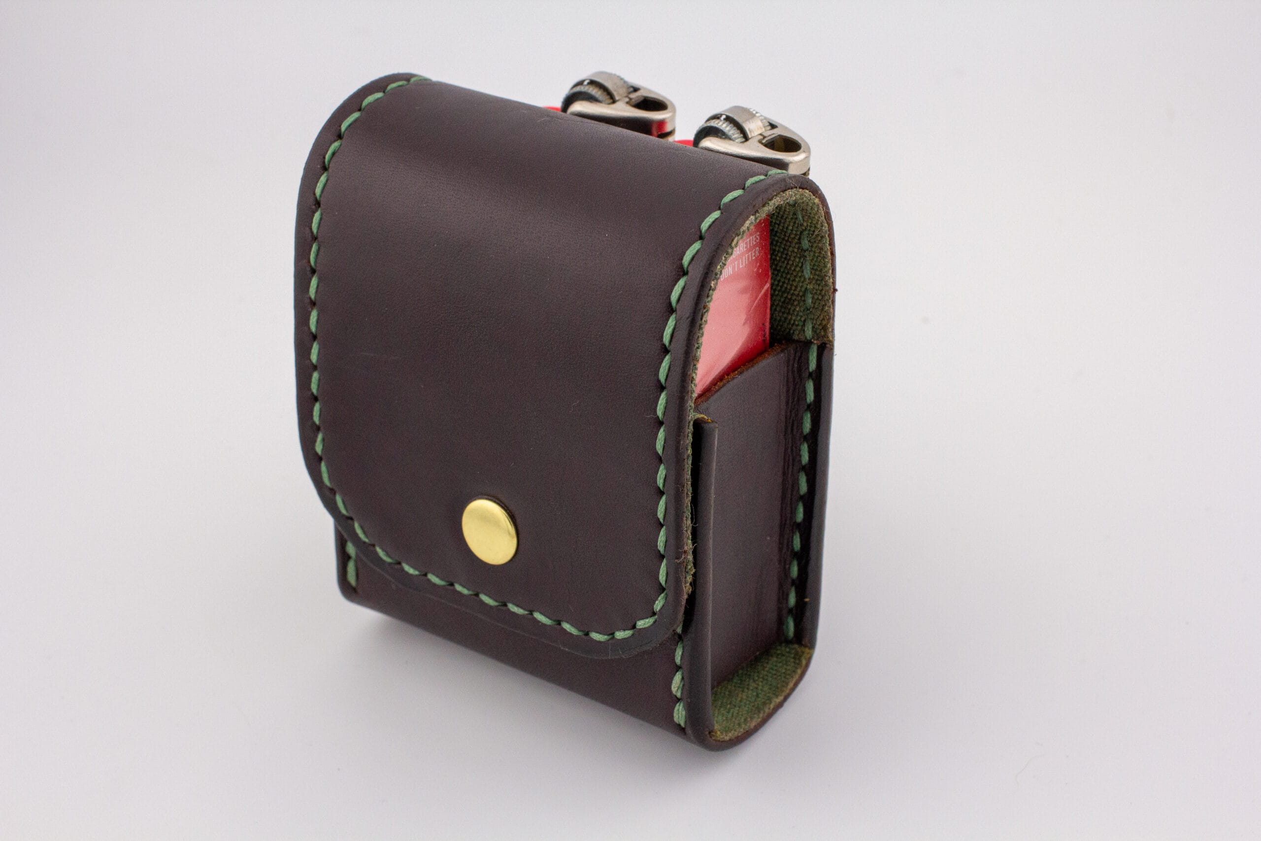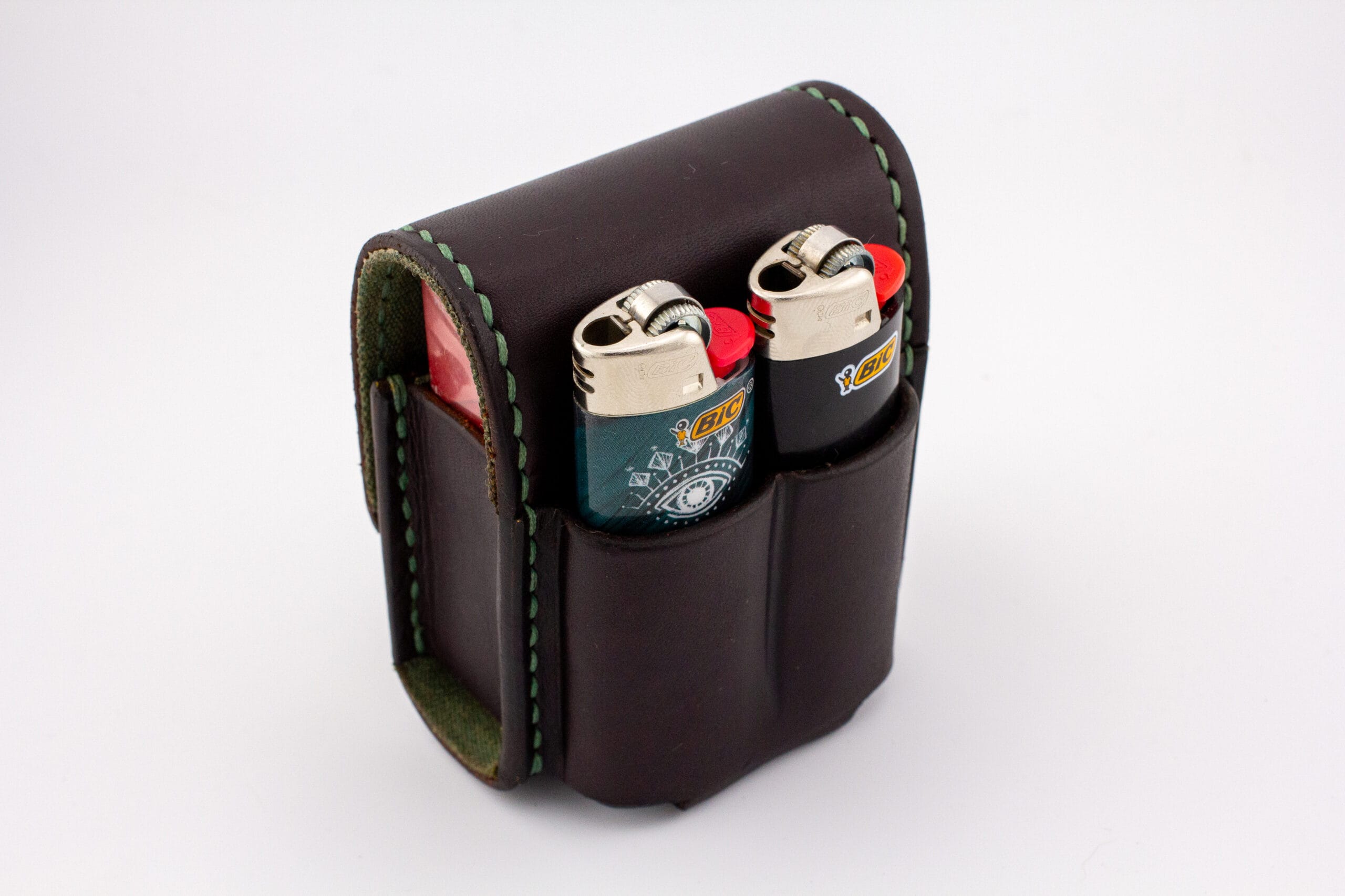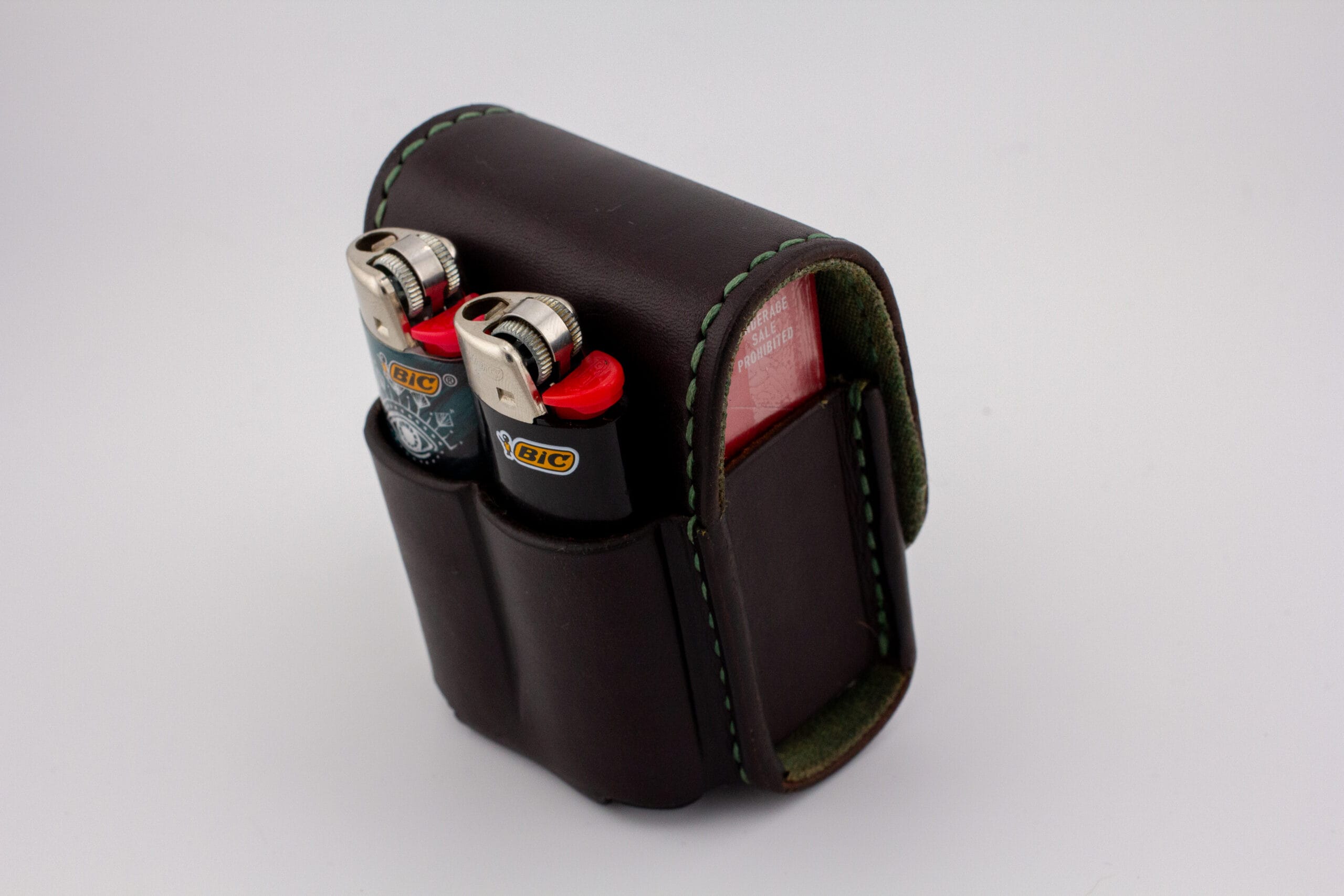 Made for the daily use. Cut from Wickett & Craig bridle leather and hand-stitched with Ritza Tiger thread, this case is firm on day one and breaks in like a favorite pair of boots. Inside, a Sunbrella canvas liner keeps things clean and durable. On the back, a dual Bic lighter holder—one to light, one in reserve. It all closes with a solid brass snap that ages to a warm, honest patina.