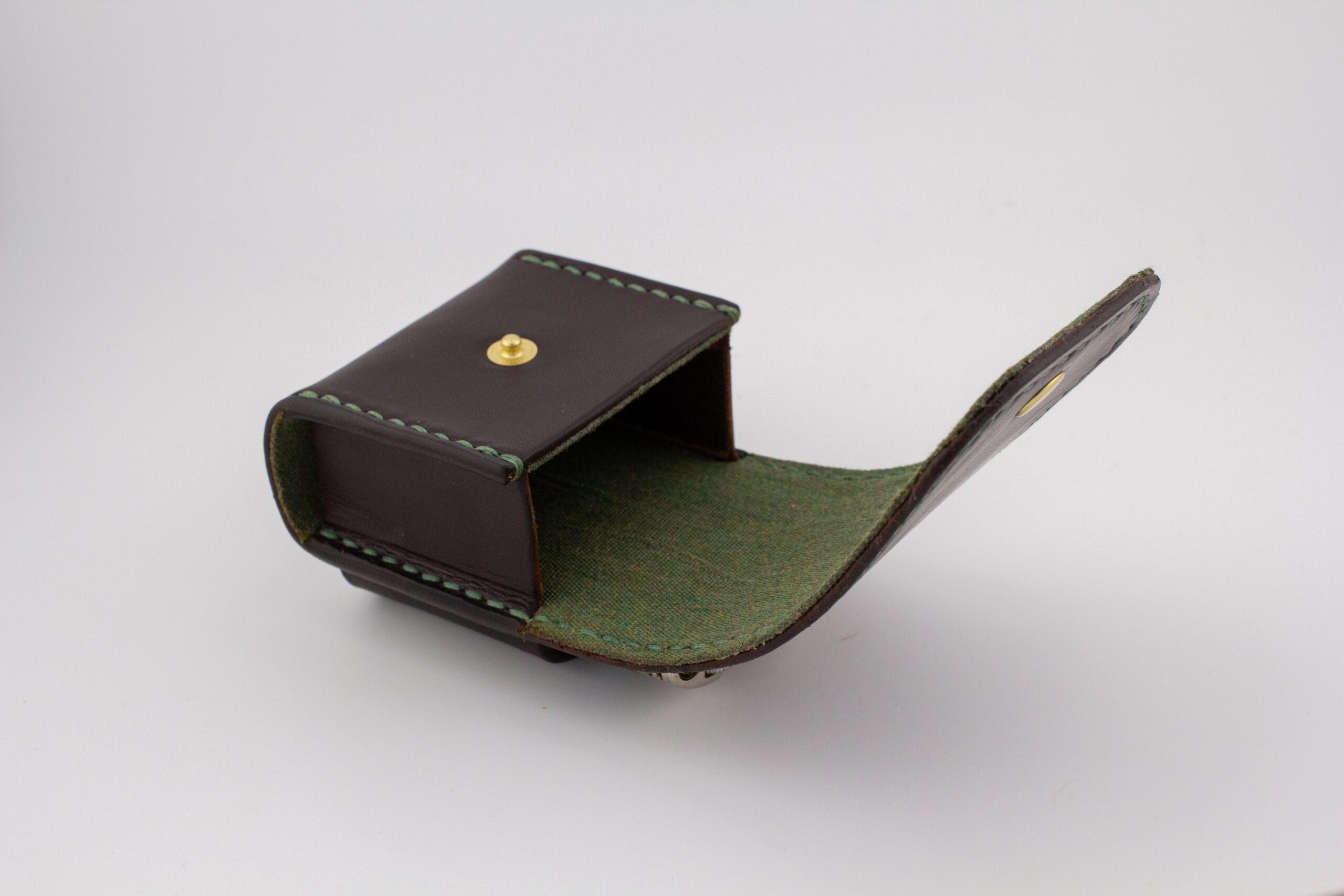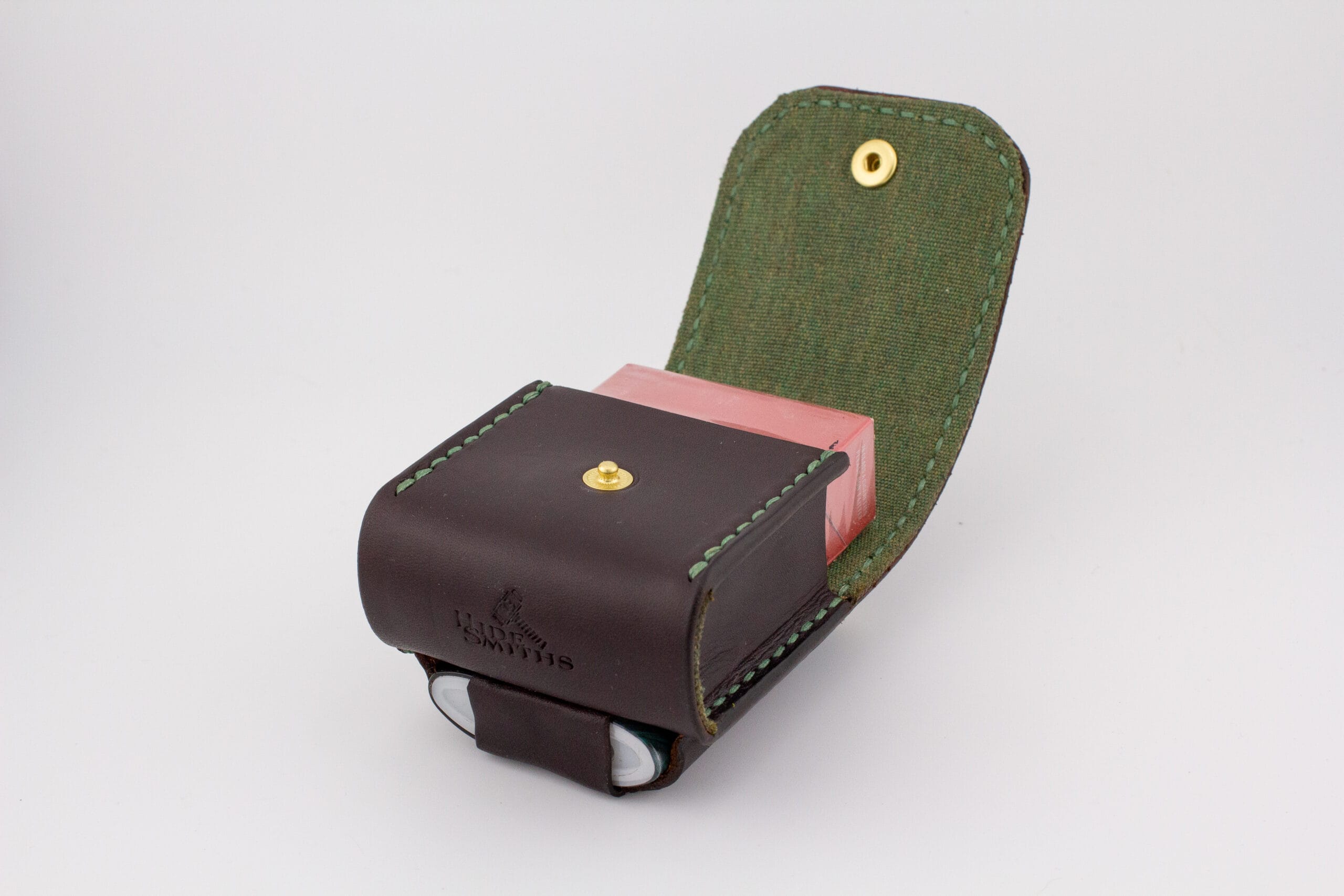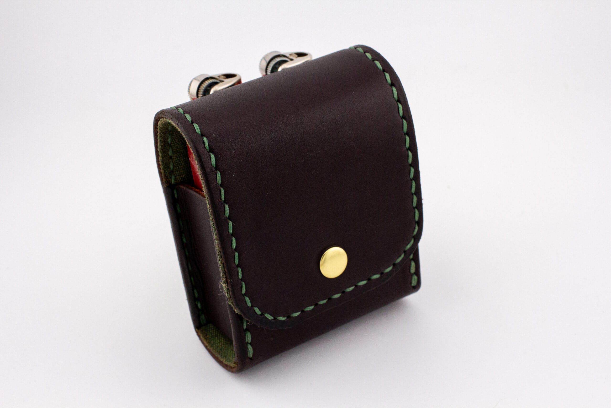Made for the daily use. Cut from Wickett & Craig bridle leather and hand-stitched with Ritza Tiger thread, this case is firm on day one and breaks in like a favorite pair of boots. Inside, a Sunbrella canvas liner keeps things clean and durable. On the back, a dual Bic lighter holder—one to light, one in reserve. It all closes with a solid brass snap that ages to a warm, honest patina.